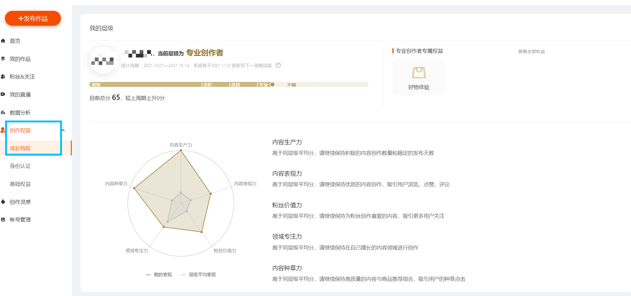 创作者成长综合分值由创作者的内容生产力、内容表现力、粉丝价值力、领域专注力、内容种草力五大维度组成,每项分值为账号对应维度能力的考量。