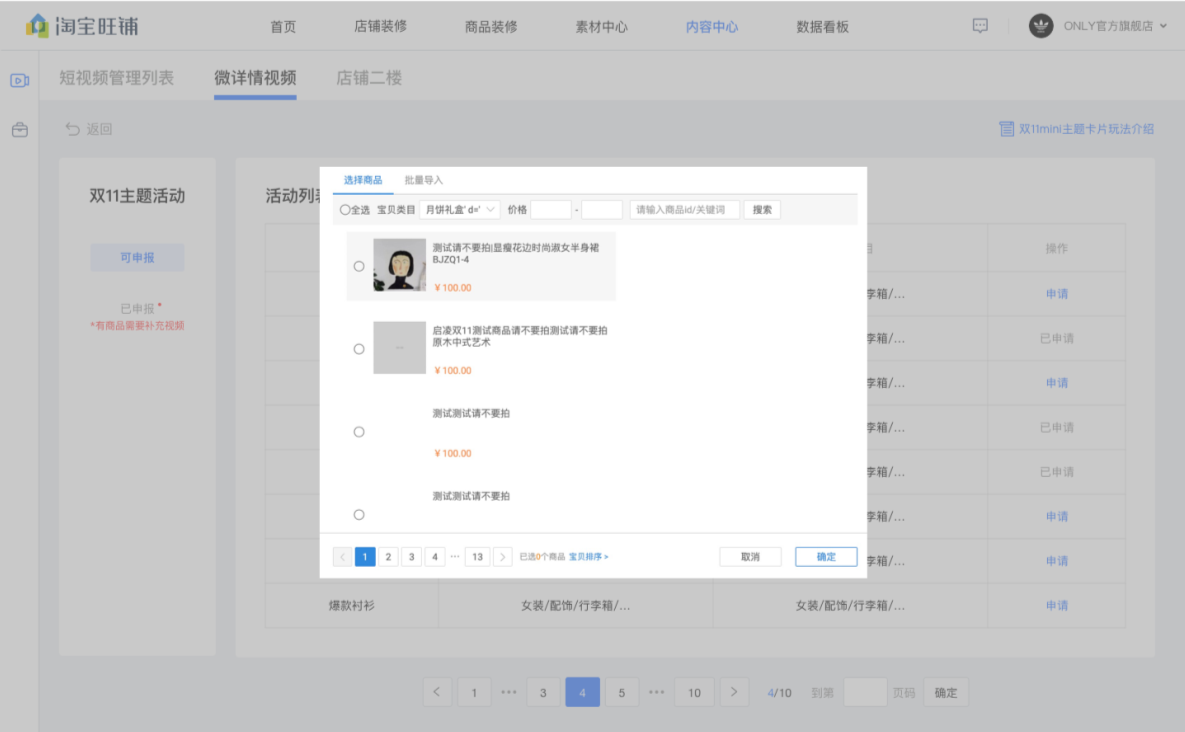 d. 同一个主题同一商家,“最多”只能报名10个商品,且每个商品必须有视频