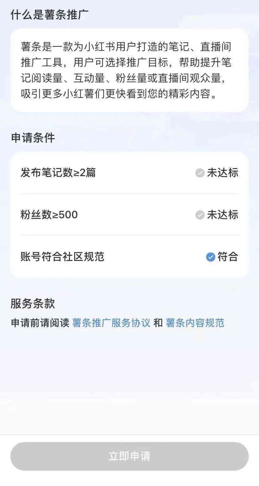 但是开通薯条推广功能需要一定的条件,已发布的笔记数量≥2篇,且粉丝数≥500,另外不能有违反社区规范的行为。