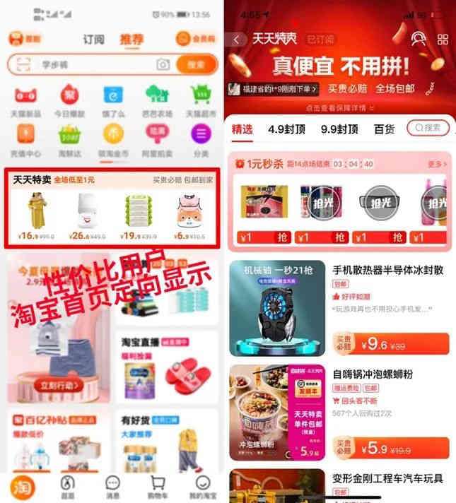 被算法圈选的4亿的性价比消费者,可在淘宝首页看到天天特卖;也可以直接淘宝搜索“天天特卖”进入主会场;此外手机淘宝里“签到红包”、“淘金币”等,模块也和天天特卖有联动。