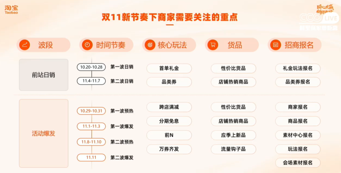 1.时间:11.1日0点场;11.11日0点场;预热时间与大盘预热时间保持一致(与之前相比场次减少,帮助商家零点爆量)