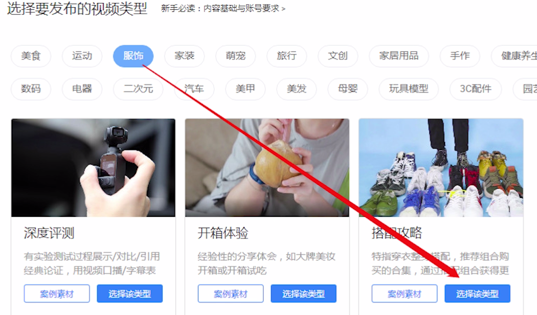 第二步,在右侧选择视频所属类目领域选择想要发布的视频类型。