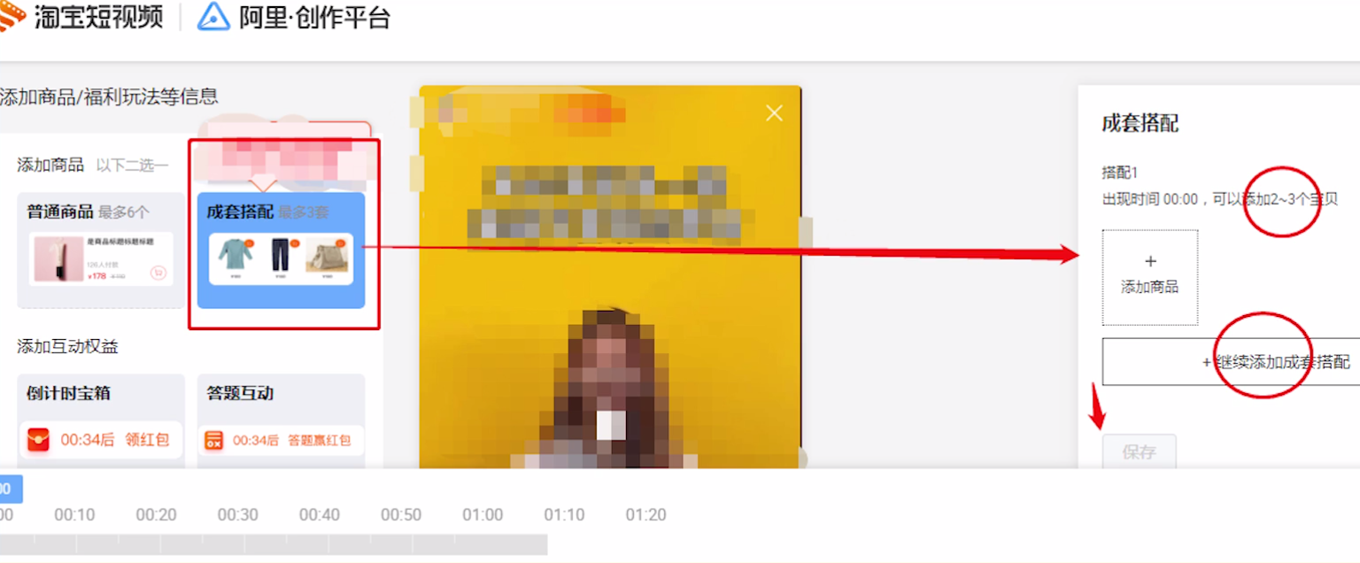 第四步,选择左侧成套搭配,并且在右侧菜单添加商品。还可以在下方设置每套服饰出现的时间
