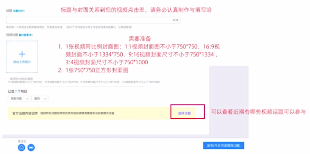 第五步,为视频添加一个标题和两张封面图。选择适合视频主题的话题进行参考。