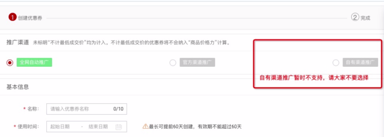 重要提醒,自有渠道推广券暂时不支持,即使在商家中心创建了,在创建奖池的时候也看不见这个优惠券。