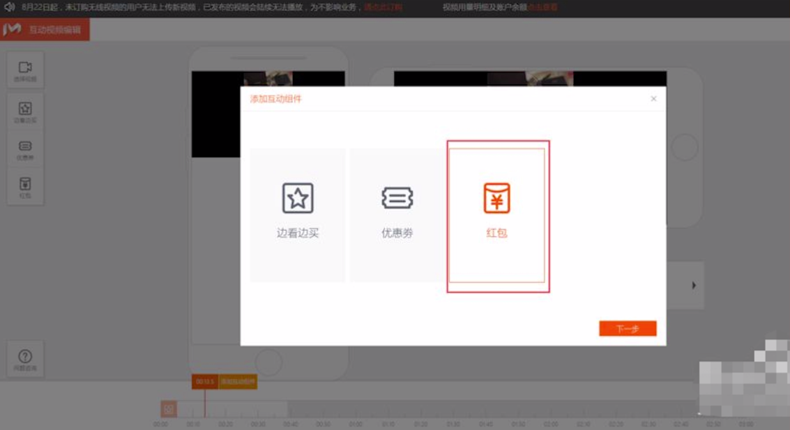 1.权益和奖池设置完毕后,在短视频发布后台编辑互动视频时候,添加下一步即可。