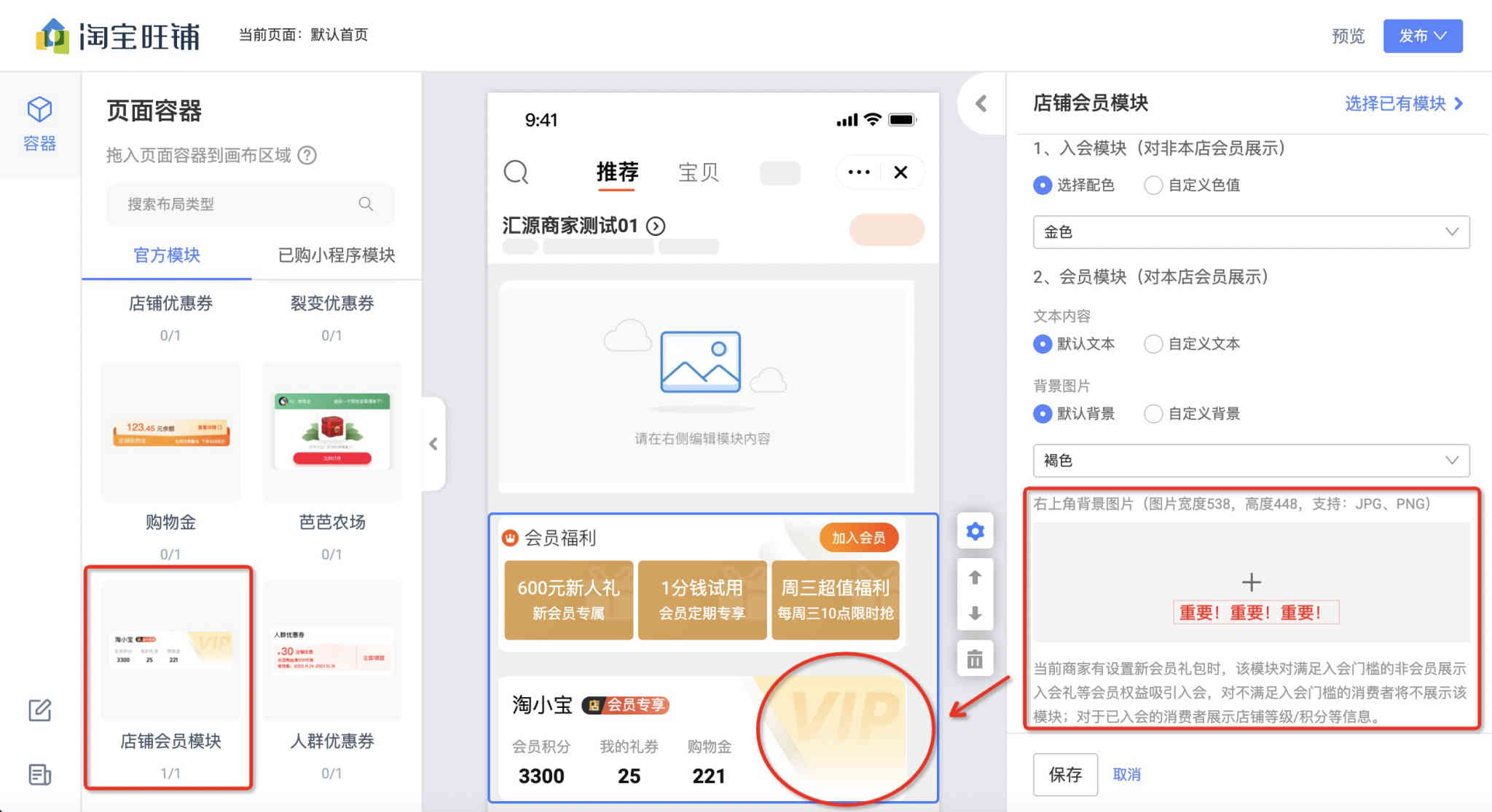 ③保存模块内容、保存并发布页面,即完成会员模块的装修。另,挑战计划模块,若商家有自定义模块背景颜色,可自主设置背景色值。