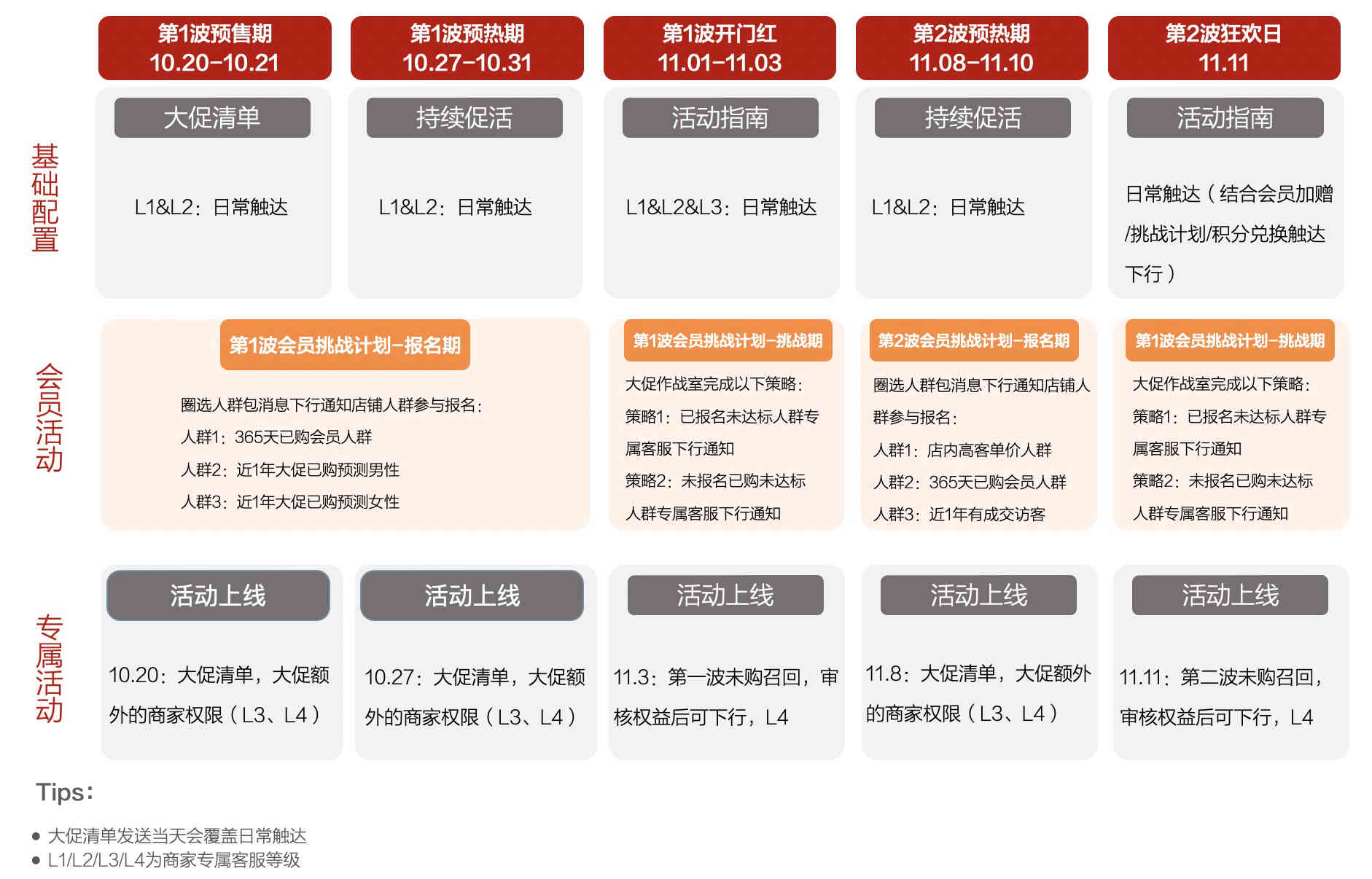 步骤二: 在正式开卖挑战期间action:本次平台上线了【已报名未达标人群】、【店铺双11期间已购尚未报名未达标人群】引导】两大官方人群,商家可在大促作战室使用两大人群去做专属客服、短信的渠道推广,针对【已报名未达标人群】提醒凑单购买拿礼包、针对【店铺双11期间已购尚未报名未达标人群】提醒去报名挑战计划后凑单拿礼包。