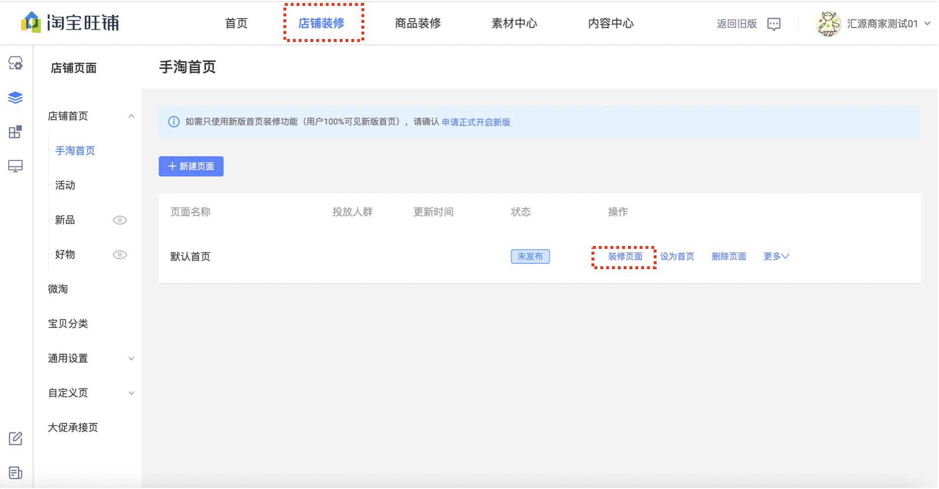 ①登录旺铺装修后台,找到需要装修该模块的首页页面,点击装修页面进入页面装修后台