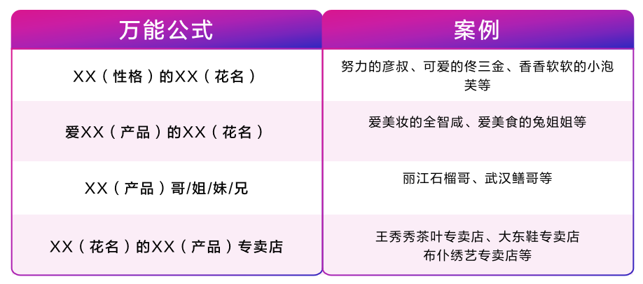 在给非店铺账号命名时,需注意设置的昵称需好理解、好记忆、好传播且定位清晰。不知道如何给账号设计吸引人的昵称,可以参考这张表格