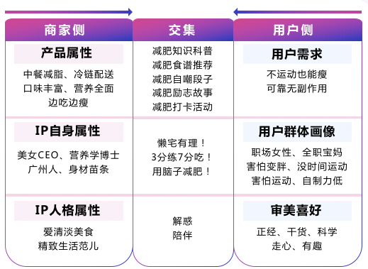 例如下表,一家冷链减脂中餐产品厂家通过商家侧和用户侧信息对碰,勾勒出的营养学博士讲解减脂与饮食科普的账号定位。