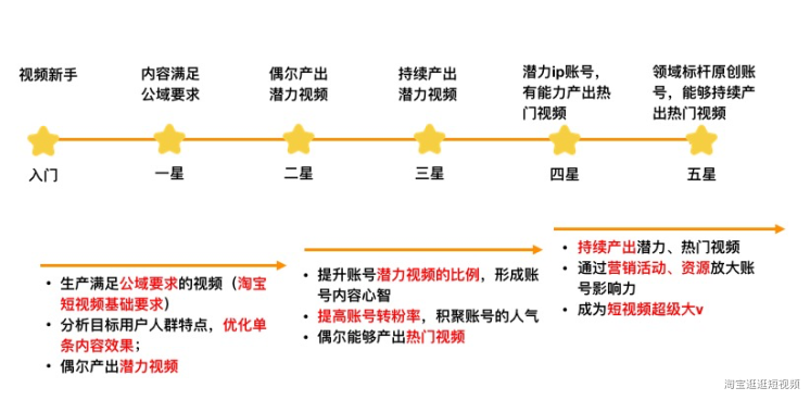 为了帮助短视频创作者更有效的进行视频质量优化和账号能力提升,短视频星级根据创作者能力特征把账号成长分为6个阶段,并且明确了每个阶段的创作者主要提升的方向。