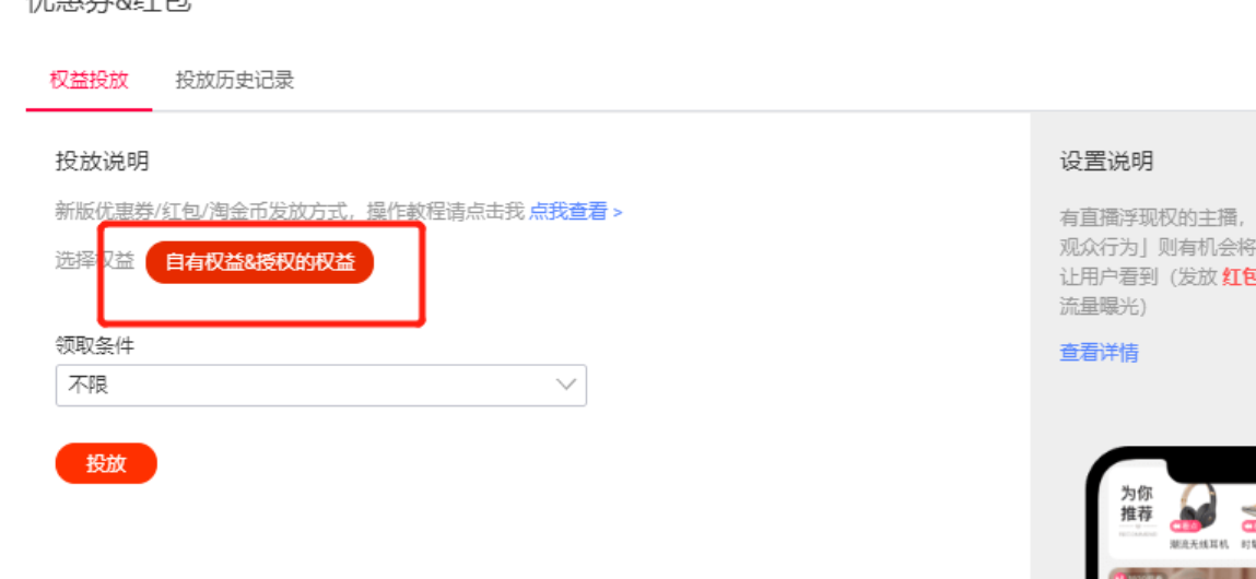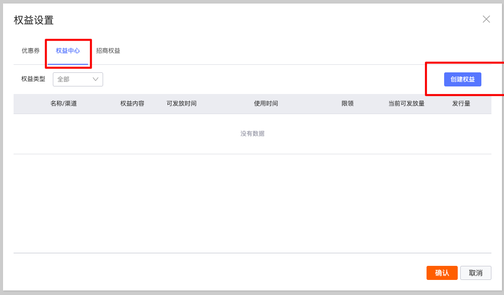 2.进入界面后,选择自有权益&授权的权益,或者创建新的优惠权益