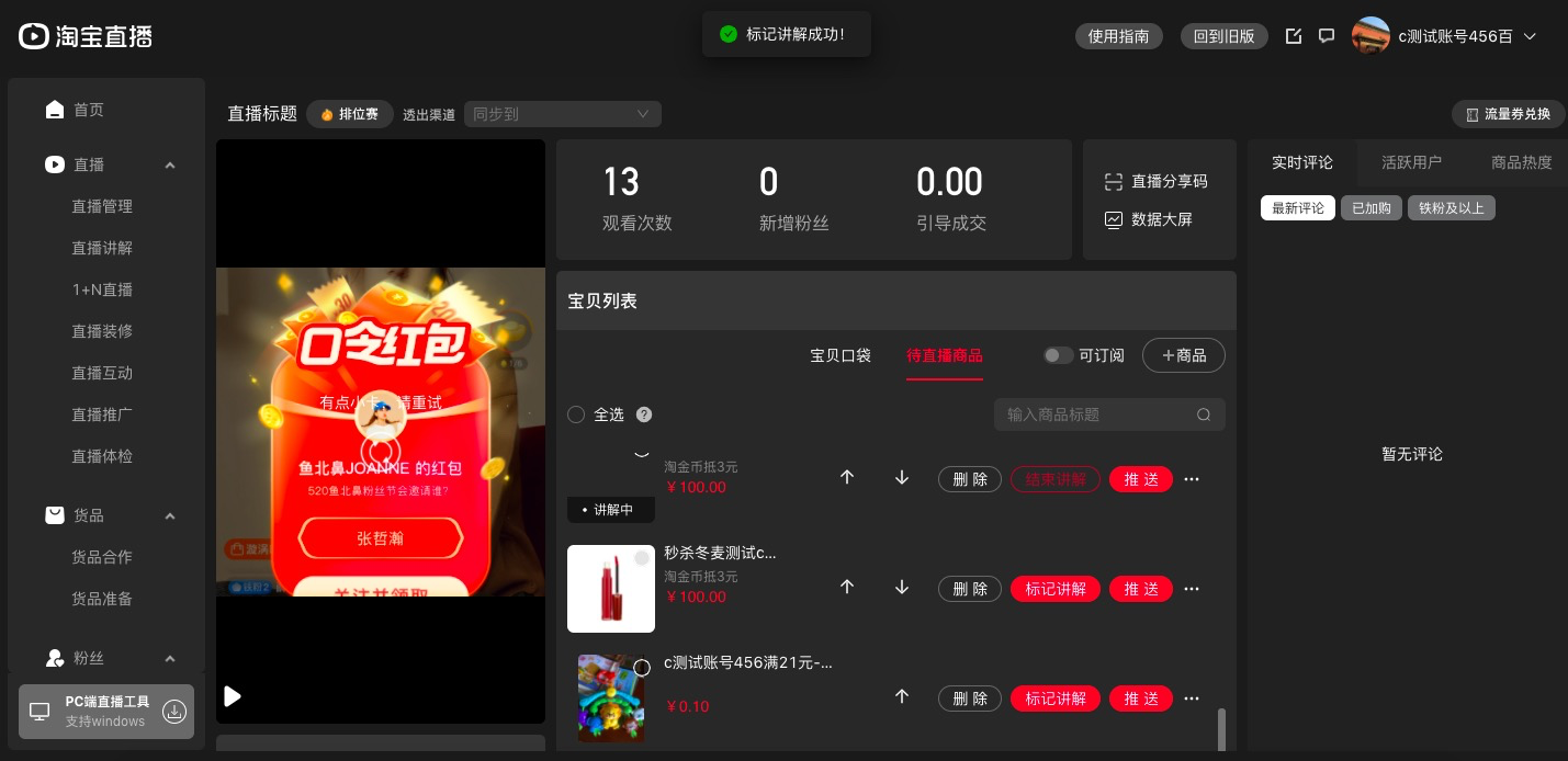 5、确保正在讲解的宝贝,和被标记"直播讲解"的宝贝信息吻合一致