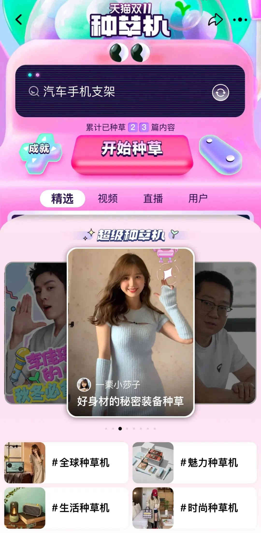 在种草机里有各类潮流明星覆盖了全类人群,来分享自己的屯货清单,变身人型种草机来给各位用户进行好物种草。除了有明星,里面还有大量的达人,用户除了可以在自己喜欢的达人那里找好货,消费者还能实时看到“购物潮流”,从每日种草热榜和随机出现的高热度搜索词条里发现种草新的好物。比如在10月11日的种草热榜里,秋冬时节女孩们关心的“正确护肤步骤科普”成了第一名,只要点进去,就能看到海量的护肤相关内容。无论你是护肤小白,还是精致护肤达人,都能在种草机页面里找到想要的。
